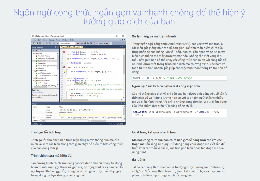 Ngôn ngữ lập trình: Ngôn ngữ lập trình tiên tiến hỗ trợ bạn tạo các chỉ báo và hệ thống giao dịch cá nhân. Các thuật toán phân tích kỹ thuật được viết dễ hiểu và nhanh chóng cùng với hơn 200 chức năng AFL tích hợp.