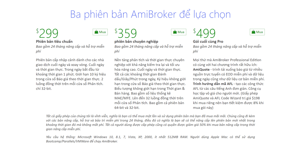 Lưu ý: Mặc dù cung cấp nhiều công cụ nhưng AmiBroker không có sẵn dữ liệu. Vì vậy, để hỗ trợ cho việc giao dịch tốt nhất, các nhà đầu tư sẽ phải mua dữ liệu từ bên ngoài rồi đưa vào phần mềm. Có nhiều gói dữ liệu với mức giá khác nhau tùy theo tính năng và nhu cầu của nhà đầu tư.
