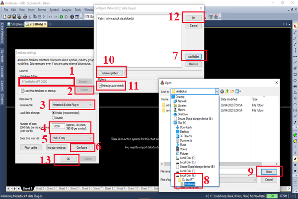 Tiến hành thiết lập theo các bước trong hình, ở bước số 2 chọn plugin 32 (nếu nhà đầu tư sử dụng Amibroker 64 bit thì có thể click vào 64 bit).