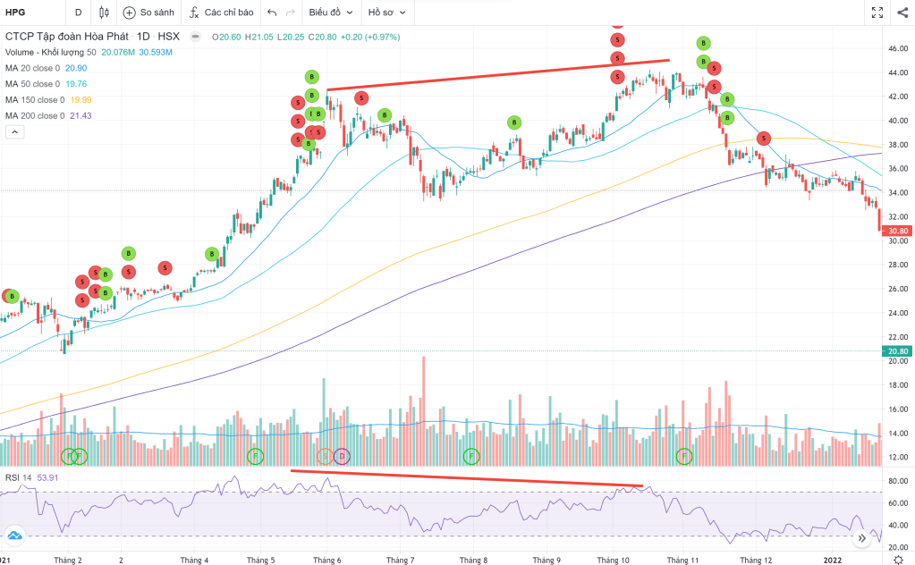 Sự phân kỳ của RSI và giá, báo hiệu một xu hướng chuẩn bị kết thúc, và giá sẽ đảo chiều từ tăng qua giảm.