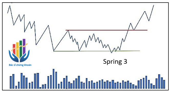 - Spring 3 – Test spring: Chuyển động giảm giá hướng về các đáy của khung giá để kiểm định lực bán có còn quyết liệt hay không. Khối lượng thấp tại các điểm test tại đáy cho thấy lực bán yếu, biến động giá thu hẹp. Đây là loại Spring mạnh nhất mà bạn có thể tham gia mua cổ phiếu.