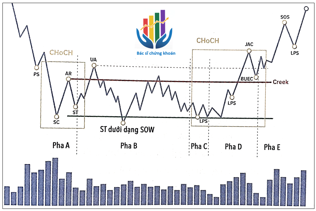 CHoCH (Change of Character) Thay đổi trong tính chất: Nó đánh dấu bối cảnh mà ở đó, giá sẽ sớm chuyển động. CHoCH đầu tiên được hình thành ở pha A, trong đó giá chuyển từ xu hướng giảm sang bối cảnh củng cố. CHoCH thứ hai hình thành từ điểm thấp nhất của pha C đến điểm cao nhất của SOS (dấu hiệu mạnh) mà ở đó giá chuyển từ môi trường củng cố sang môi trường xu hướng tăng.