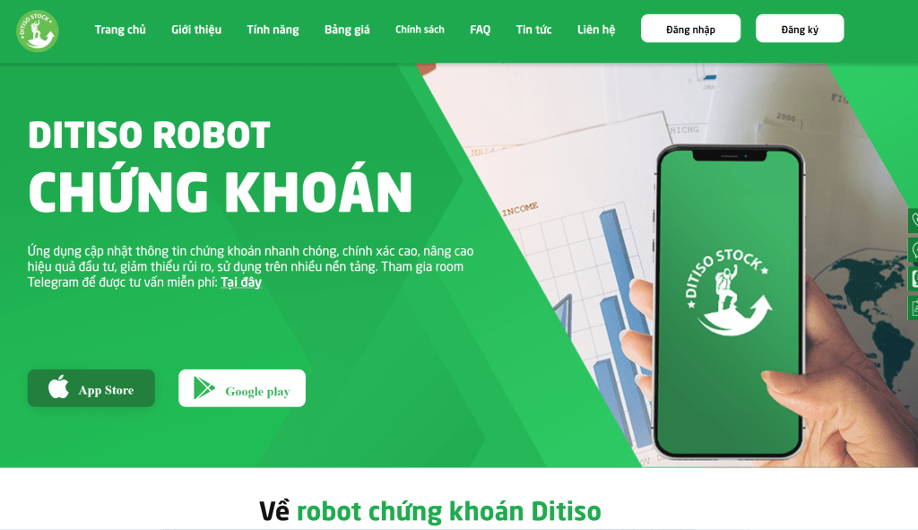 Với triết lý “Đầu tư chứng khoán luôn có lợi nhuận”, Ditiso là một hệ thống dùng công nghệ AI để lập trình nên Robot thông minh để phân tích kỹ thuật dựa trên các thuật toán. Từ đó có thể chỉ ra sự chính xác về khả năng định hướng tương lai của cổ phiếu.