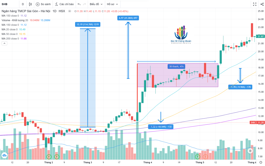• Đầu tiên phải có cú tăng giá mạnh với KL lớn, giá CP có thể tăng 100% hoặc hơn trong 8 tuần (khá yên tĩnh trong GĐ1)