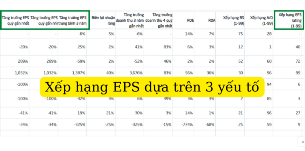 Xếp hạng EPS (EPS rating) được xây dựng dựa trên việc đánh giá tăng trưởng thu nhập tổng hợp của doanh nghiệp gồm tăng trưởng EPS quý gần nhất, tăng trưởng EPS quý gần nhì và tăng trưởng bình quân 3 năm gần nhất.